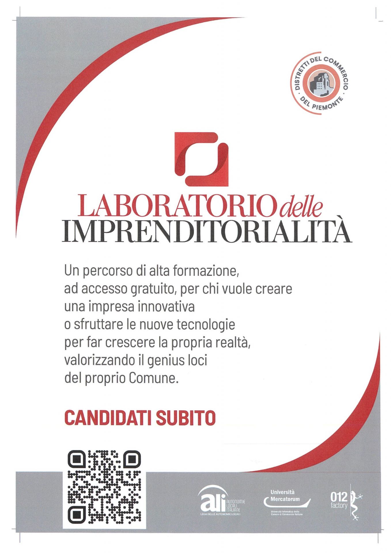 Nella mattinata del 12/02 con lo scopo di spiegare meglio l'iniziativa ed informare ulteriori potenziali candidati, grazie alla disponibilità di ALI Universitas Mercatorum e 012Factory, si svolgerà un Webinar online della durata di 1 ora aperto agli aspiranti imprenditori interessati al percorso formativo.