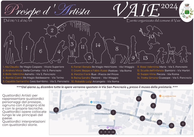 Le opere sono collocate lungo le vie principali del paese e dal 24 Dicembre verranno collocate nel cortile del Museo della Preistoria di Vaie, componendo un'unica opera artistica sulla Natività.