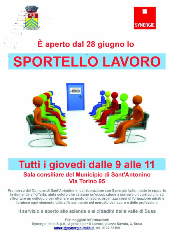 Tutti i giovedì dalle 9 alle 11 presso la Sala Consiliare del Comune di Sant'Antonino di Susa (Via Torino n. 95) è aperto lo SPORTELLO LAVORO in collaborazione con Synergie Italia.