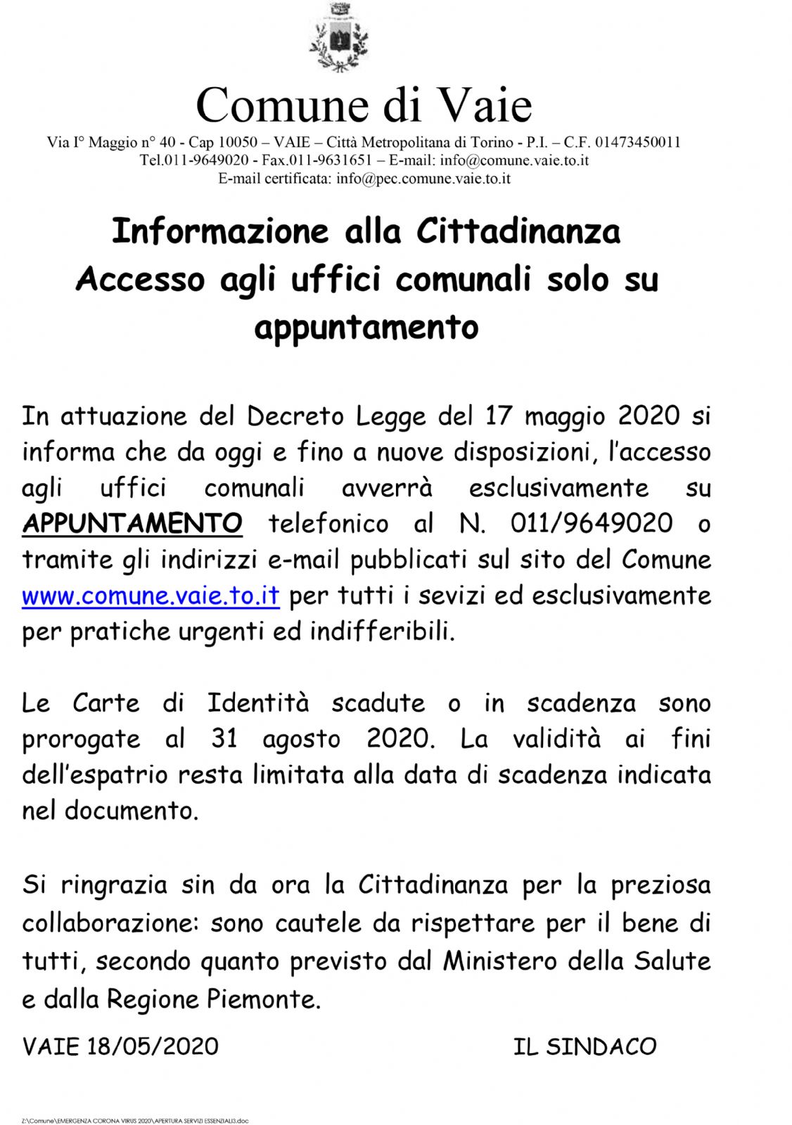 - ACCESSO UFFICI MODALITA'[.pdf 198,85 Kb - 20/05/2020]