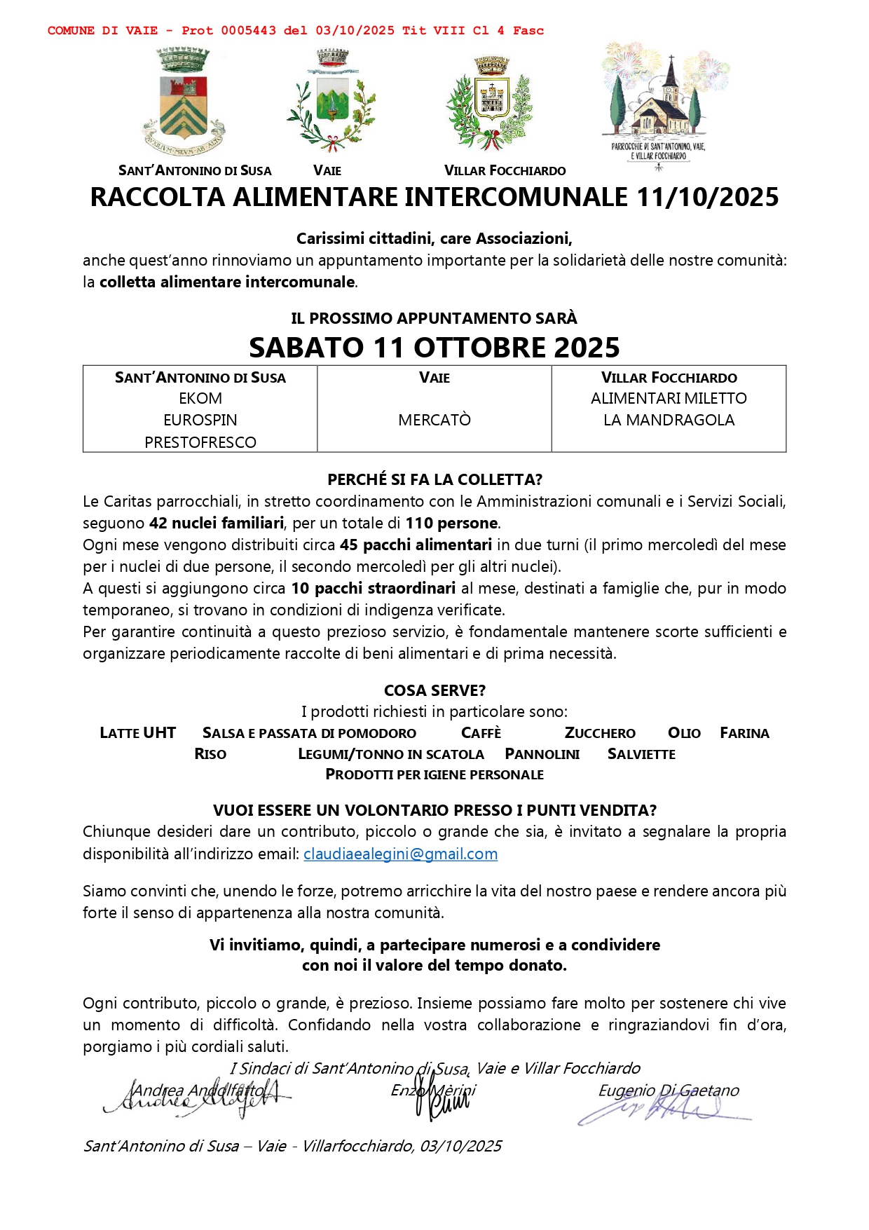 La prossima raccolta alimentare SARÀ SABATO 11 OTTOBRE 2025 presso i supermercati di Sant'Antonino (Ekom, Eurospin e Prestofresco), Vaie (Mercatò) e Villar Focchiardo (Alimentari Miletto e La Mandragola).